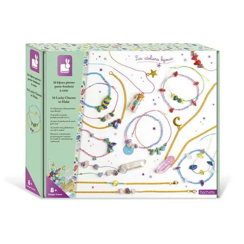 ¡Crea tus joyas con piedras de verdad, eligiéndolas por su color o por su significado! Este kit creativo permite realizar 16 pulseras y collares hechos con piedras de verdad. Los niños pueden seguir los pasos detallados en el folleto paso a paso para hacer cada modelo de joya. ¡Pero podrán elegir las piedras que prefieran, que se adapten a su estado de ánimo o que les traigan suerte