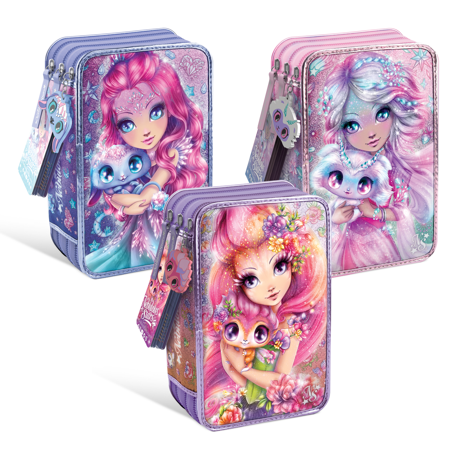 Las Nebulous Stars están contigo a donde vayas, incluso en la escuela! Esta colección de estuches deluxe con 3 compartimentos incluye un completo set de papelería con lápices, marcadores y accesorios, todo con el encanto único de la marca Nebulous Stars.