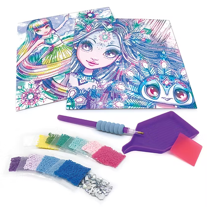 Crea 2 deslumbrantes obras de arte! Pega piedrecitas con un aplicador especial sobre plantillas previamente encoladas. Sigue los números asociados a cada color. ¡El resultado final es espectacular!