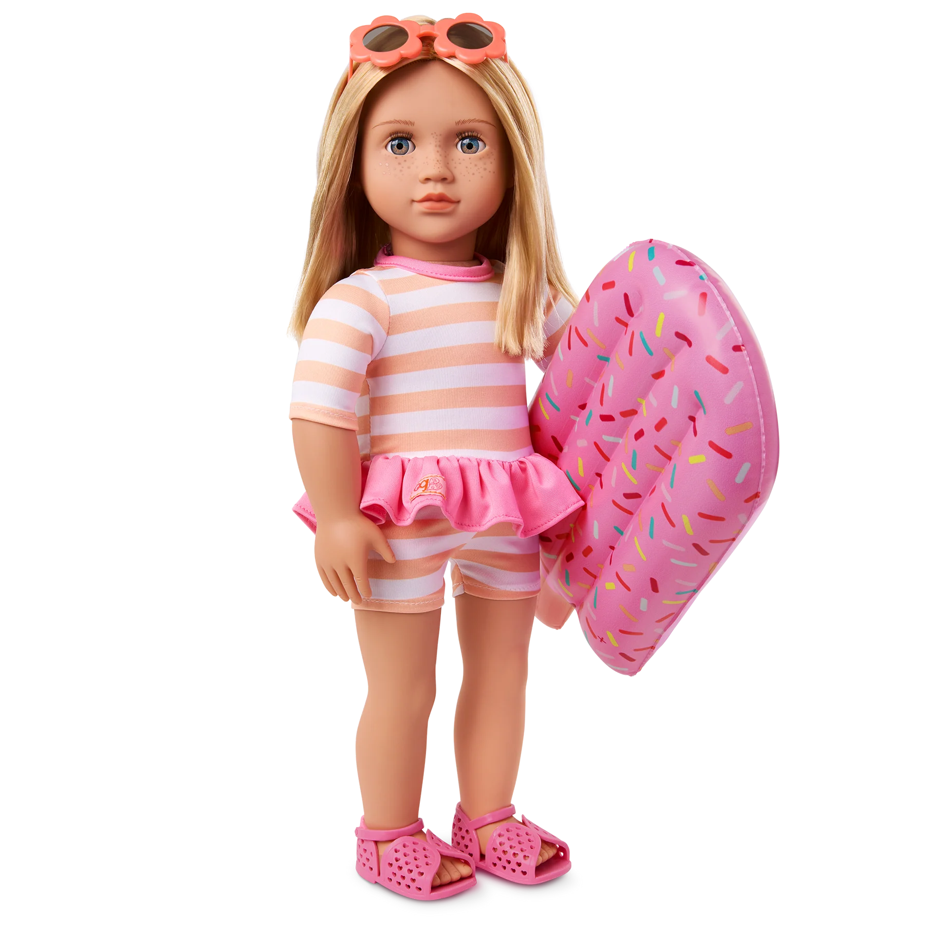 - Moda infantil: Margot lleva un traje de baño deportivo con lindas rayas y cintura rosa con volantes, gafas de sol con flores y sandalias de punta abierta. ¡También viene con un flotador de piscina con forma de paleta que los niños pueden inflar a la perfección!