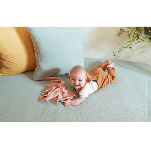 Este alegre peluche Lapinoo de color terracota será el compañero perfecto para tu bebé. Con su lado de pana, combina dos materiales y se adapta perfectamente a la comodidad del bebé. Tiene un estilo sobrio y delicado. Su pañuelito le da un toque refinado. El peluche Lapinoo destaca por sus largas orejas, que son de lo más encantador.