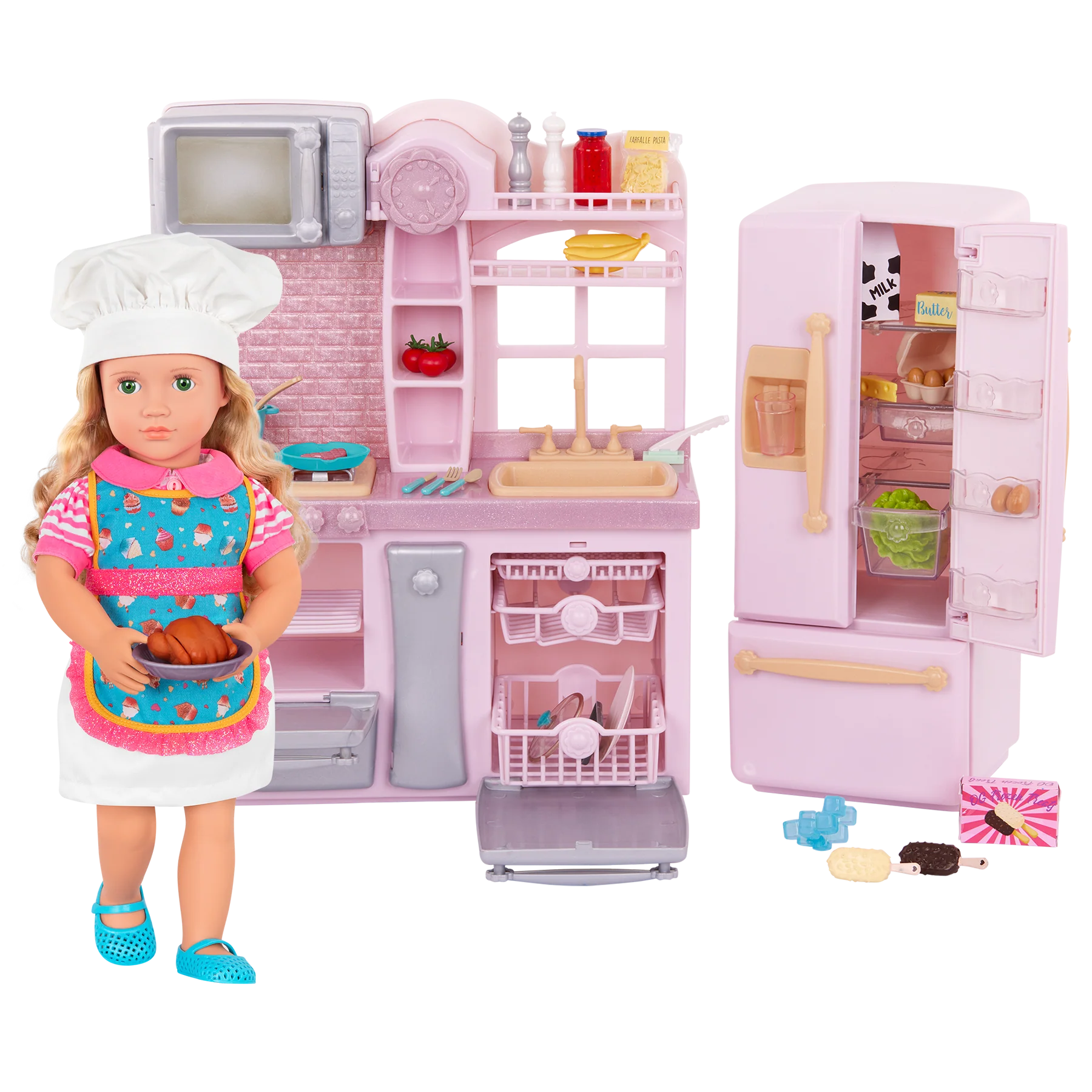 El Gourmet Kitchen Set de Our Generation es un conjunto de cocina diseñado para muñecas de 46 cm. Este set incluye una unidad de cocina completa con electrodomésticos funcionales, un refrigerador, utensilios de cocina y alimentos de juguete realistas, ofreciendo a los pequeños chefs todo lo necesario para preparar deliciosas comidas en su propio espacio.