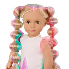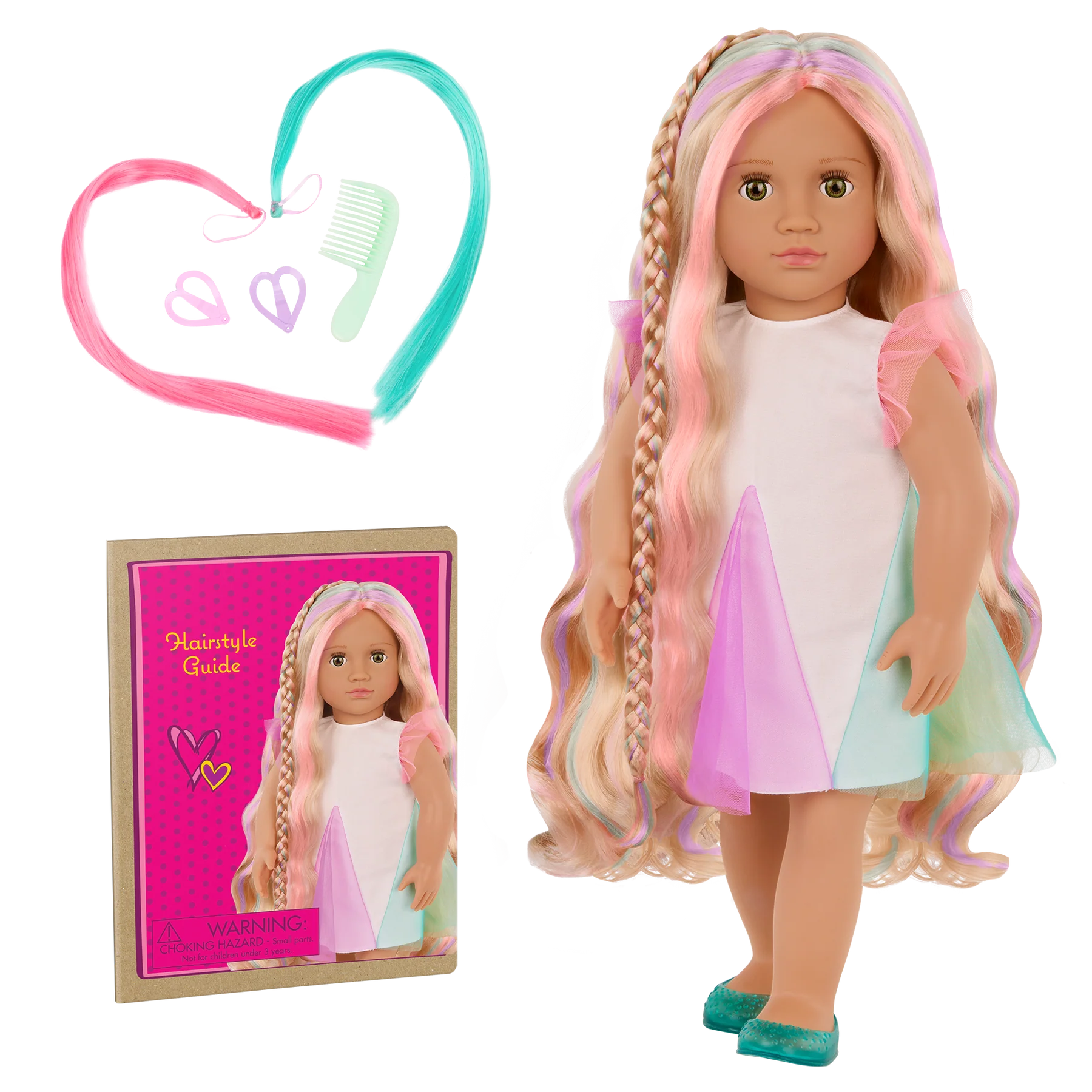 - Incluye: muñeca de 46 cm, lindo vestido con tul arcoíris, un par de ropa interior, zapatos casuales, un peine, 2 extensiones de cabello de colores, 2 pinzas para el cabello en forma de corazón y una guía de peinado paso a paso para crear 4 hermosos looks.