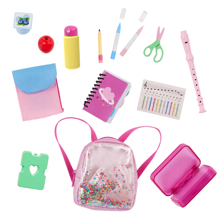 El set Our Generation Ready for School para muñecas de 45 cm tiene todo lo que las niñas necesitan para explorar horas de historias en el aula. La mochila rosa brillante está diseñada con confeti de estrellas arcoíris y se abre con cremallera para guardar los útiles escolares de tu muñeca, incluyendo un cuaderno, una grabadora de música y una partitura. Además, viene con adorables juguetes de comida para llevar en la lonchera, ¡desde una manzana y yogur hasta una botella de agua y una bolsa de hielo! Los artículos más pequeños, como rotuladores, un lápiz y tijeras, caben perfectamente en el estuche para mayor espacio de almacenamiento. ¡Las pequeñas aprendices estarán listas para comenzar el año escolar con estilo! Los accesorios para muñecas Our Generation son un regalo fantástico para niñas a partir de 3 años (piezas pequeñas), animándolas a imaginar sus propias historias. Es un complemento perfecto para sets escolares y colecciones de muñecas. Las muñecas Our Generation se venden por separado.