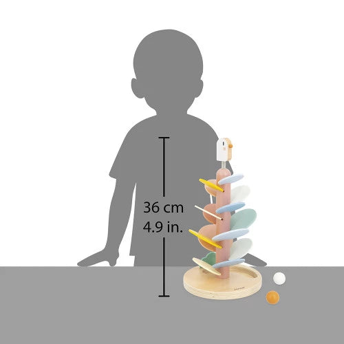 ¡Comienza el esperado descenso! Incluye 2 bolas de madera que ruedan por las hojas, produciendo una cascada de sonidos suaves y repetitivos.