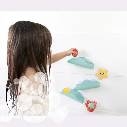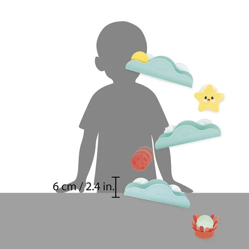 ¡Diversión asegurada en la bañera! Este circuito de madera para el baño permite a los más pequeños rodar las 3 bolas sensoriales y observar su recorrido, fomentando el desarrollo de la lógica y la motricidad fina mientras juegan.