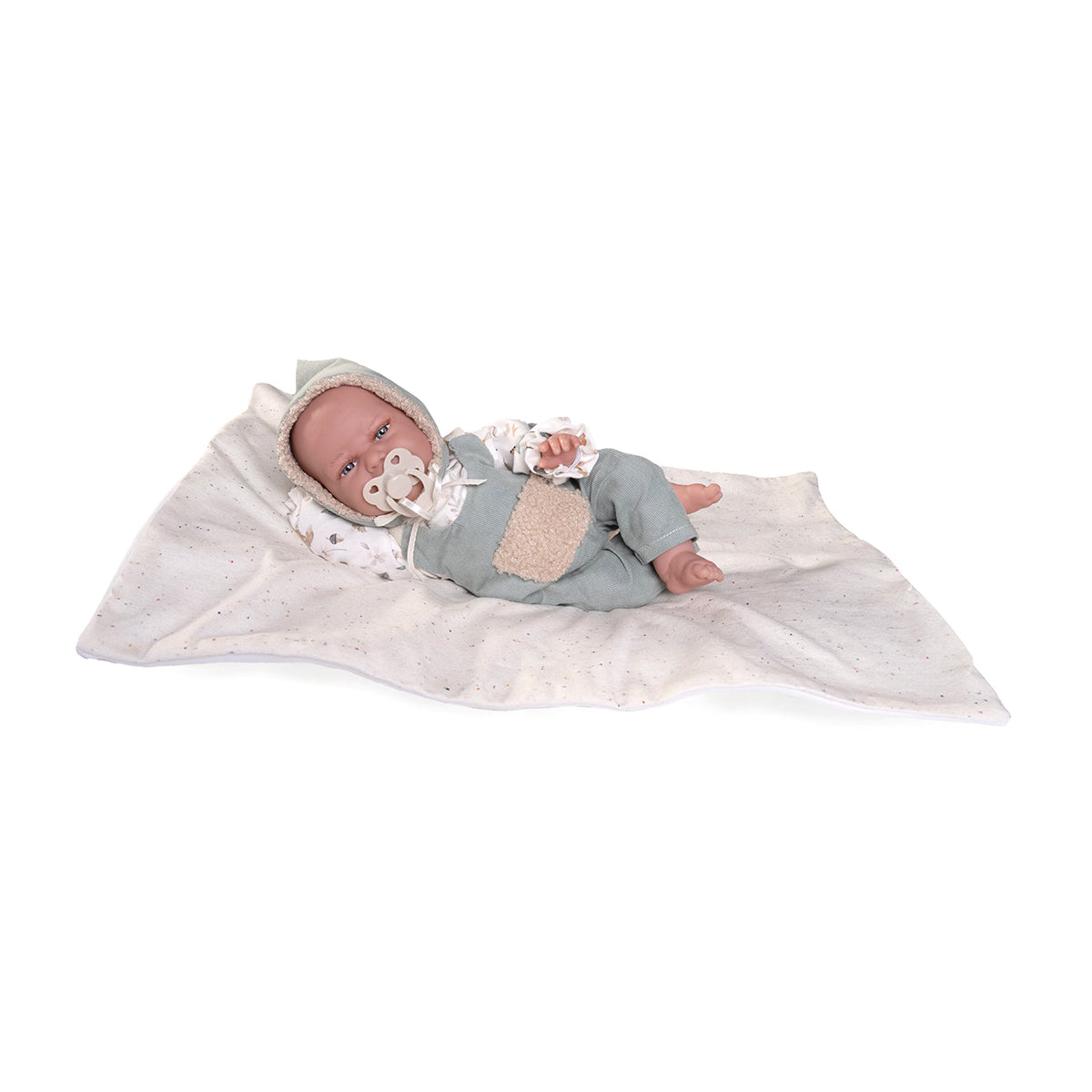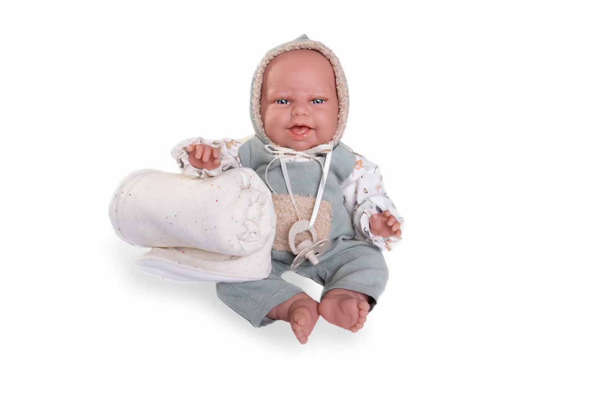Esta muñeca es muy coqueta y viene vestida con un precioso peto de pana y un borreguito con capucha, perfecto para mantenerla abrigada y lista para cualquier aventura de juego.