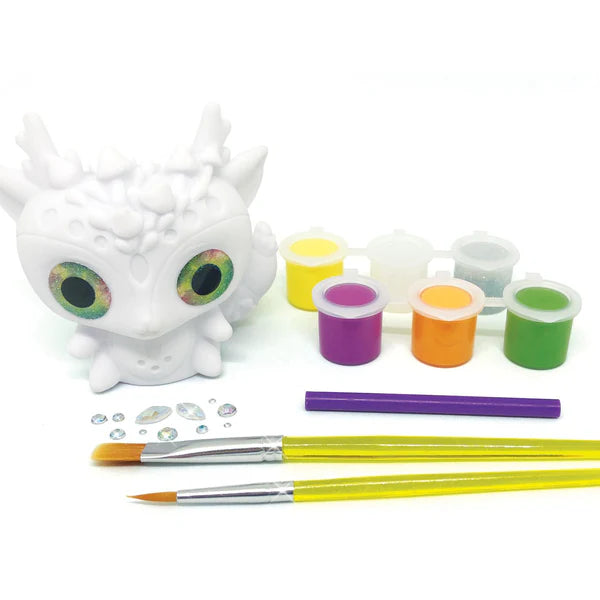 - El kit incluye 1 figura lista para pintar, 5 colores de pintura acrílica, barniz brillante, 2 pinceles, barra de plástico, pedrería e instrucciones de color.