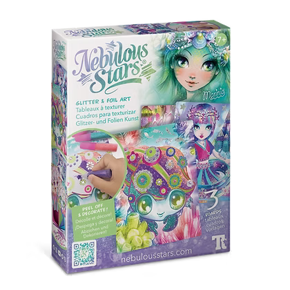 Crea obras de arte resplandecientes con un método fácil y sencillo. Retira la pieza precortada para decorar cada parte con una hoja de papel de aluminio, purpurina y gemas.