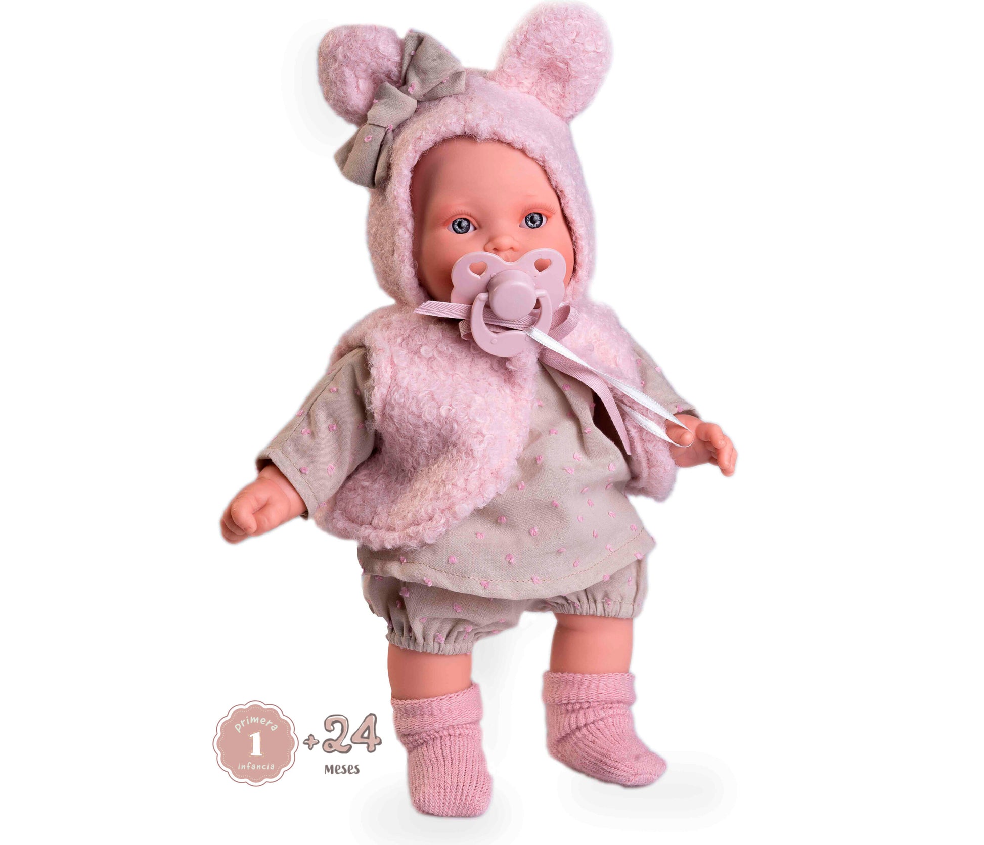 Kika es una muñeca pensada para la primera infancia, perfecta para niños y niñas a partir de 2 años. Hoy luce un conjunto muy especial: vestido, culotte y un suave chaleco con orejitas, además de un lazo en su capota, lista para salir de paseo contigo.
