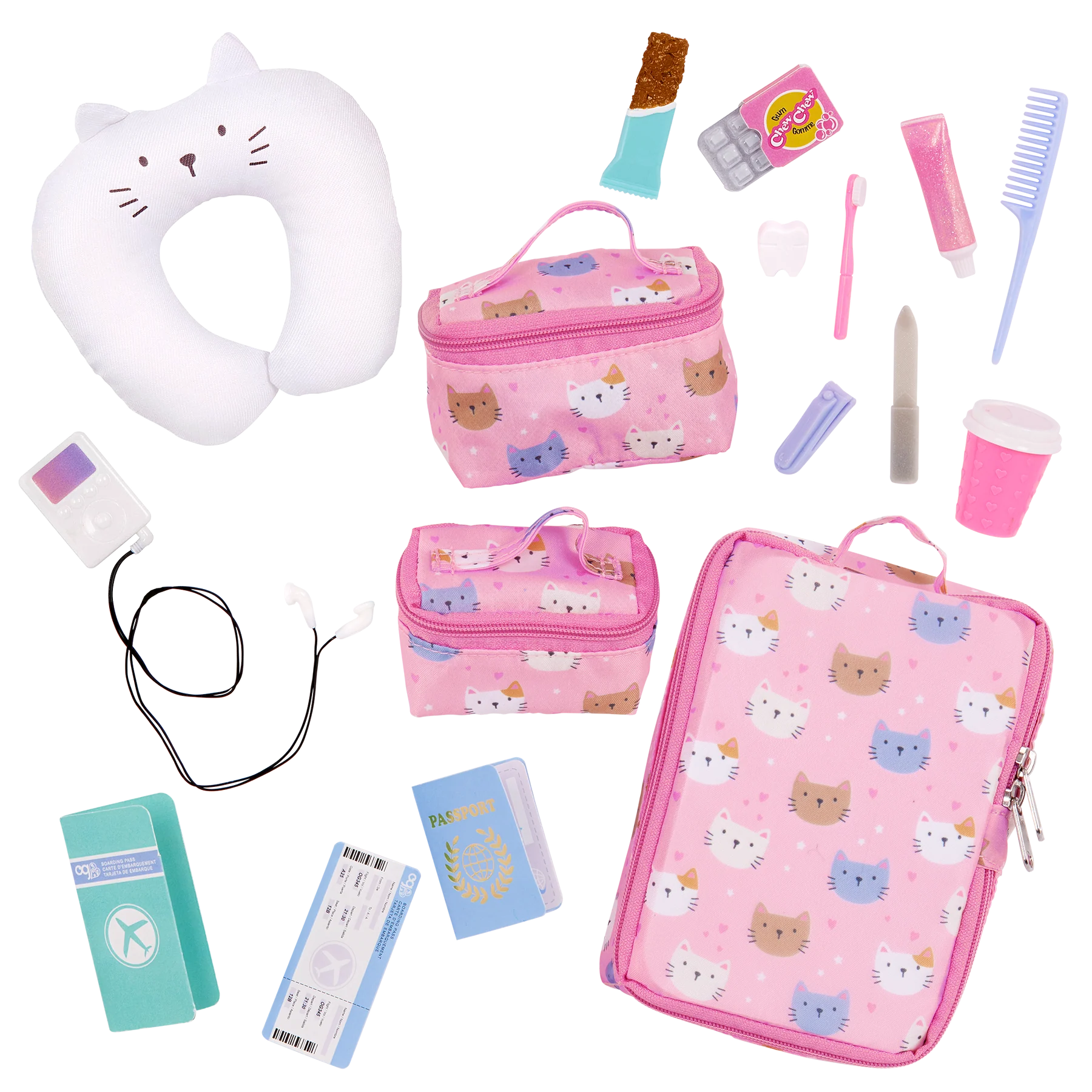 - Incluye: un equipaje con estampado de gatito y 2 bolsos de mano, almohada para el cuello, reproductor de música de juguete, auriculares, pasaporte, tarjeta de embarque con soporte, cepillo de dientes, pasta de dientes, hilo dental, lima de uñas, cortaúñas, peine, paquete de chicles, refrigerio y vaso de viaje.