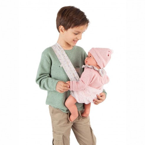 Martina viene lista para salir de paseo con un portabebé cómodo, un culotte de flores, jersey y gorrito calentito, además de pañal, como un bebé de verdad. Perfecta para acompañar a los niños en sus juegos y fomentar su creatividad e imaginación.