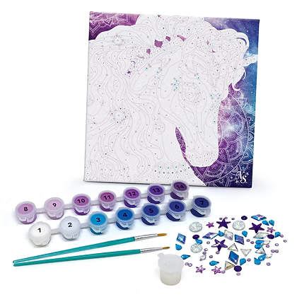 Clásica actividad para colorear por números sobre lienzo impreso enmarcado en madera. Hazlo brillar con cristales y barniz con purpurina.