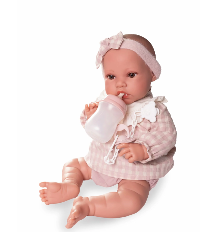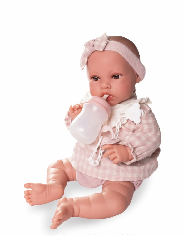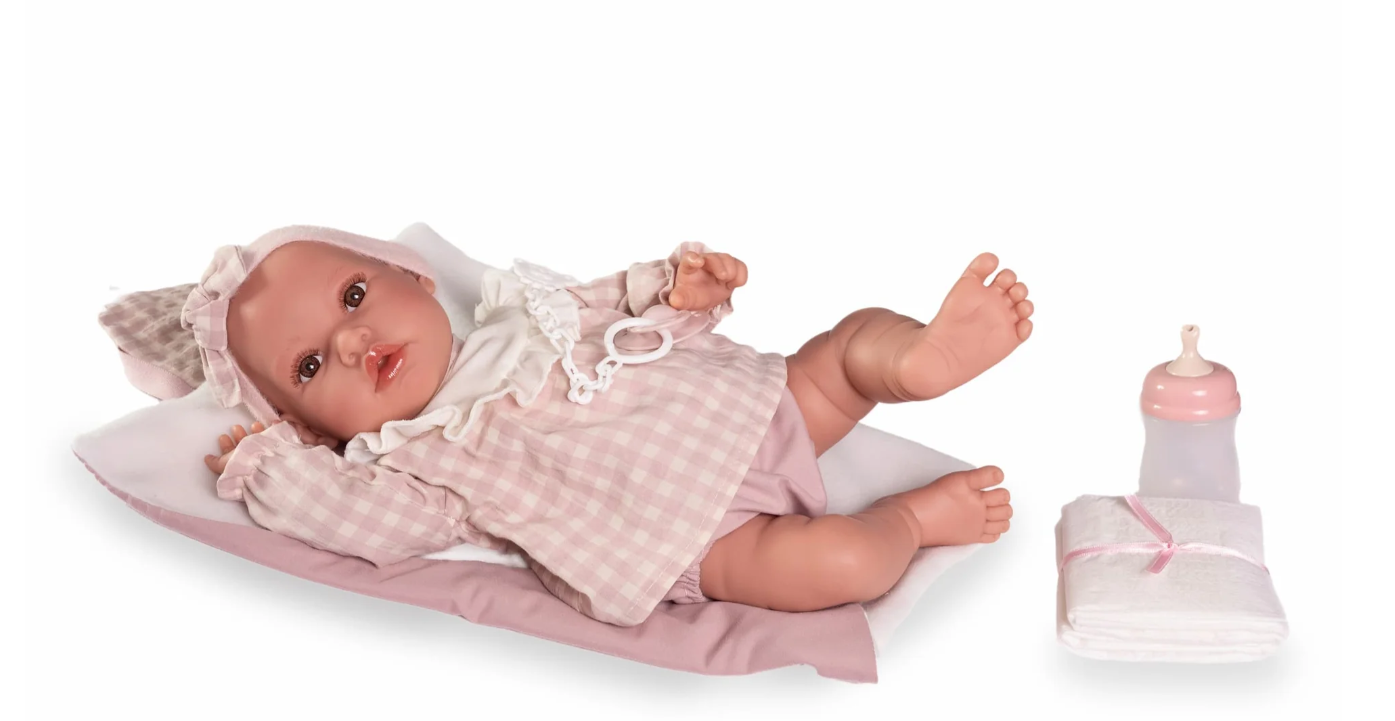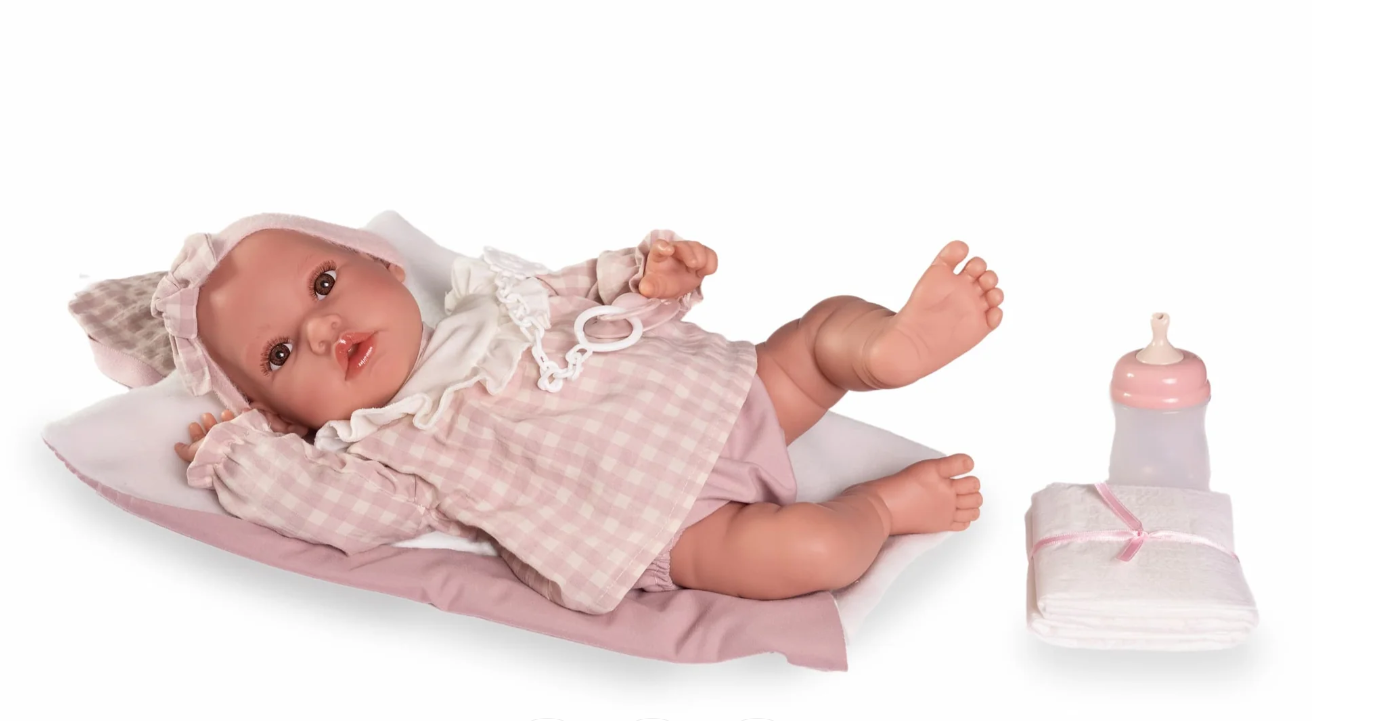 Su ropa combina el estilo clásico y moderno con un conjunto de cuadro vichy rosa, acompañado de una diadema a juego y un cambiador plegable que transforma el juego en una experiencia interactiva llena de cuidados y mimo. Ideal para pequeños papás y mamás que adoran el juego simbólico y quieren vivir la rutina de cuidar a un bebé de forma realista y segura.