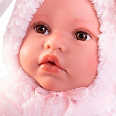 Se ha disfrazado de conejita, y viene acompañada de un peluche en forma de zanahoria, que le encanta usar durante sus juegos. Cada detalle, desde sus facciones hasta la calidad de su ropa y complementos, está cuidadosamente elaborado para ofrecer un juego realista y tierno, ideal para estimular la imaginación y el cariño hacia los bebés.