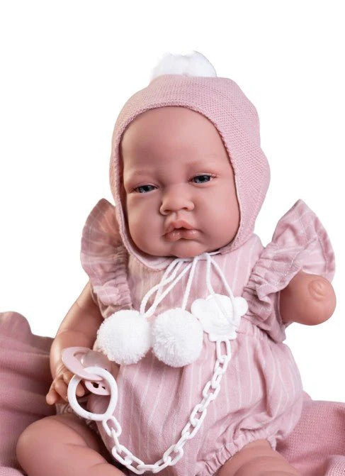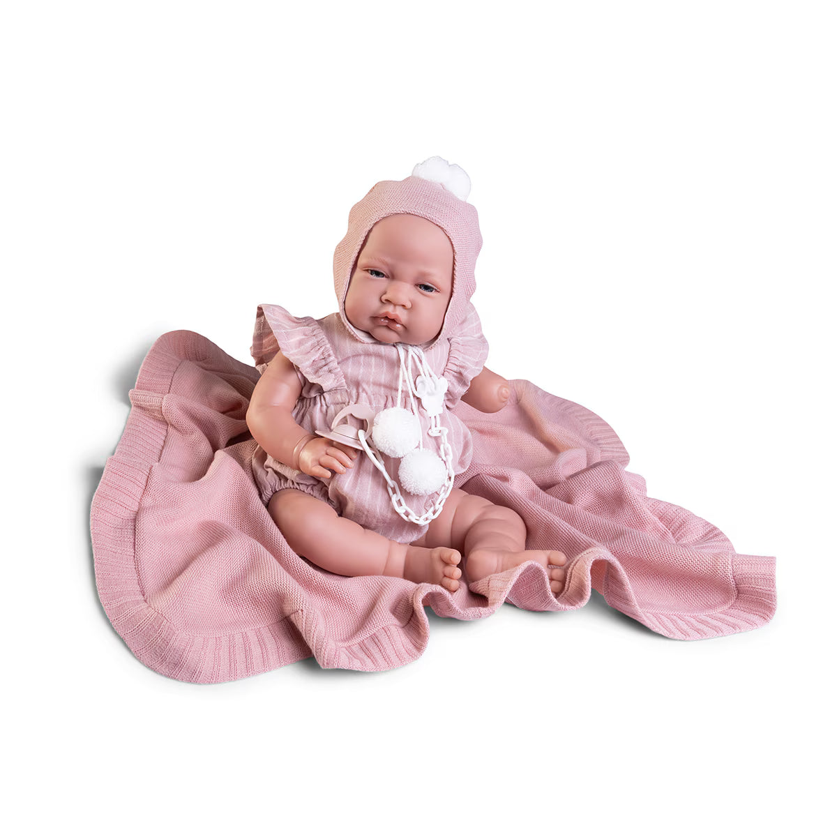 Esta muñeca Recién Nacida viene acompañada de una suave mantita, ideal para arroparla y brindar cuidados como lo harías con un bebé real. Además, incluye un gorro, pelele, toquilla y chupete con cadena, todos confeccionados con la alta calidad y el detalle característicos de Muñecas Antonio Juan. Estos accesorios no solo añaden a la apariencia encantadora de la muñeca, sino que también proporcionan más opciones para el juego imaginativo y el desarrollo de habilidades motoras finas en los niños.