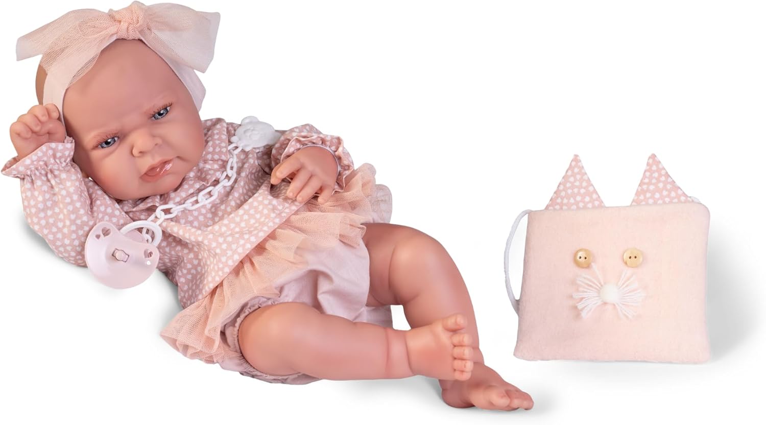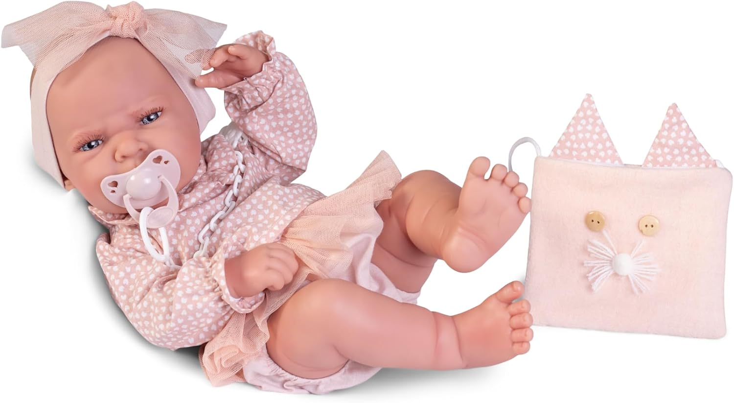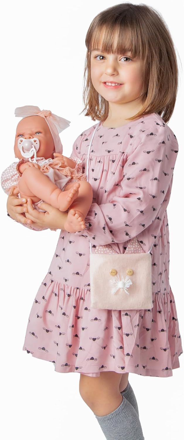 La "Recién Nacida Lea" de "Muñecas Antonio Juan" se destaca como una muñeca excepcionalmente encantadora y elegante, diseñada especialmente para aquellos niños que tienen un especial aprecio por los accesorios y la moda. Dotada de un irresistible bolsito con forma de gatito, Lea está preparada para ser la compañera perfecta en cualquier paseo o aventura que los niños imaginen. Su vestuario, compuesto por un vestido rosa, una diadema con lazo, un culotte, y una falda tutú, está cuidadosamente seleccionado para asegurar que Lea capture todas las miradas con su impecable presentación.