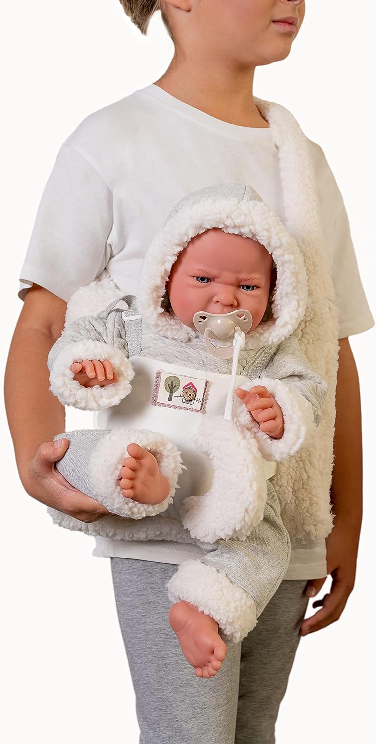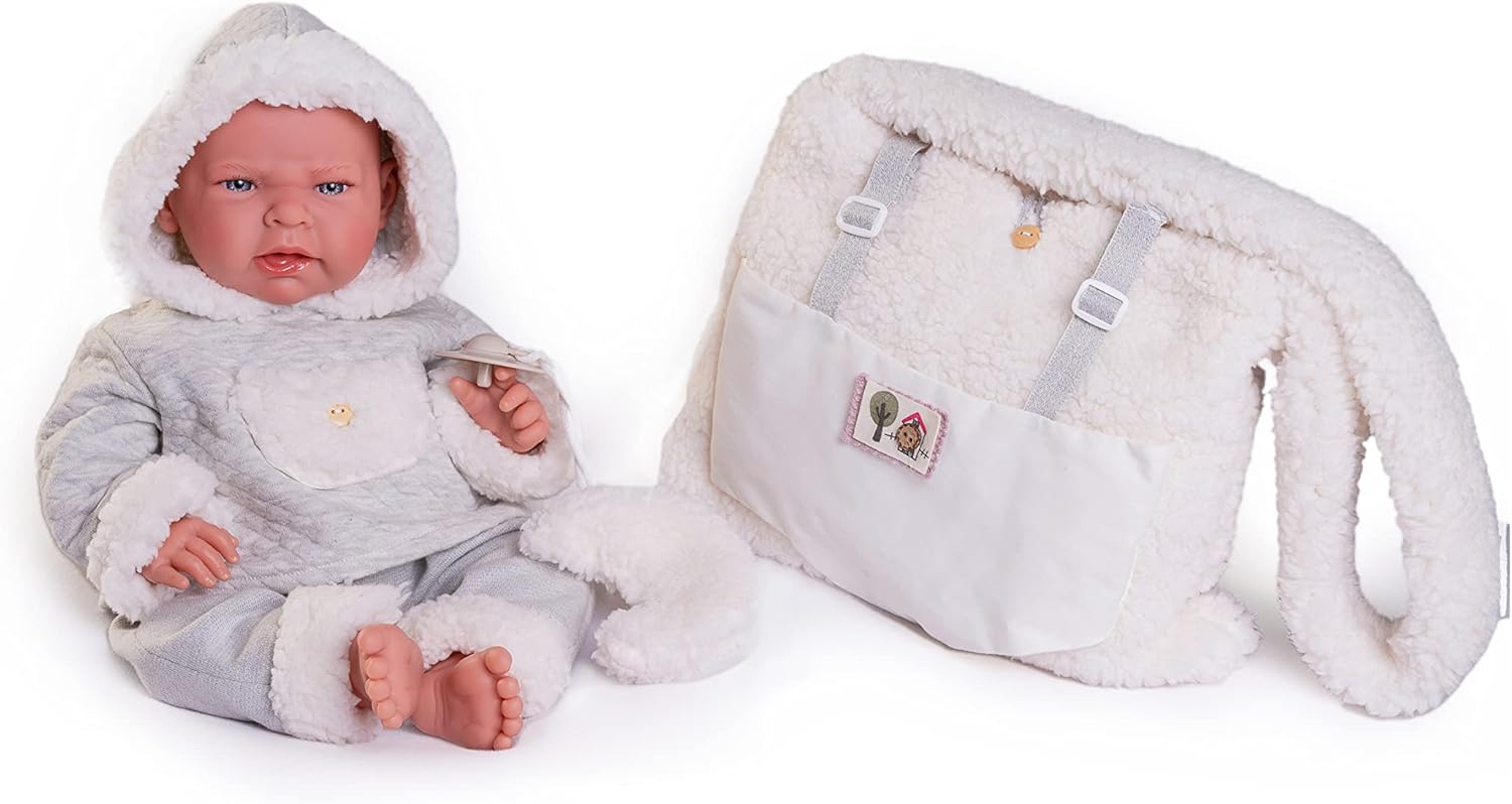 ¿Dónde te quieres llevar a la Recién Nacida Lea en el bolso portabebé? Con su calentito conjunto, Lea está preparada para ir contigo a pasear. Su traje es de tela acolchada y lleva adornos de borreguillo igual que el bolso de Lea. ¡Le encanta salir a disfrutar! Su cuerpo es de tela blandito para poder abrazarla suavemente y su cara y extremidades de suave vinilo. Mide 42 cm y pesa 900 gr. ¡Disfrutará mucho contigo allá donde le lleves! Puede colocarse en muchas posiciones como un bebé real porque sus extremidades giran, tiene movimiento, lo que le hace tener más realismo. ¿Hay algo más adorable que un bebé? Los Recién Nacidos son la esencia de Muñecas Antonio Juan. Un universo de dulzura creados para acompañar a los más pequeños a descubrir el mundo. Compañeros inseparables de largos días de juegos a los que no les falta detalle en sus tiernas facciones y calidad de su ropita y complementos.