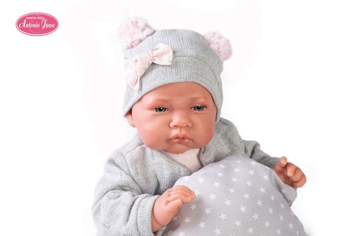Esta Recién Nacida está lista para salir de paseo y disfrutar del sol. Viste un pelele con divertidas libélulas, acompañado de un gorro con pompones, chaqueta y patucos de color gris. Le encanta descansar sobre su bonito cojín de estrellas, abrazándolo para sentirse cómoda y relajada.