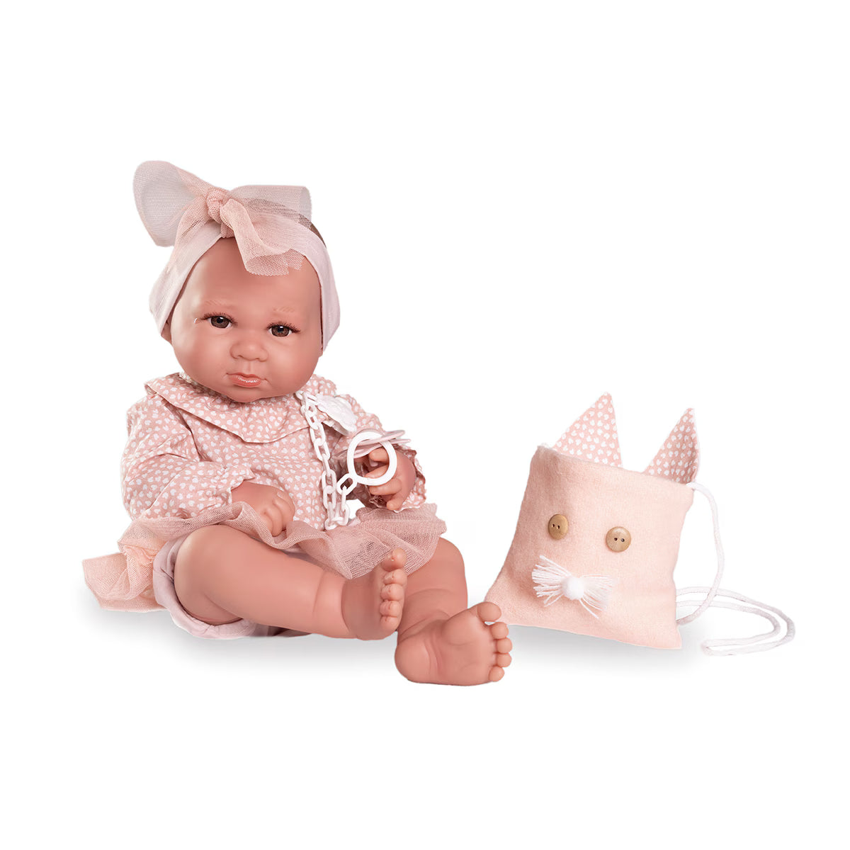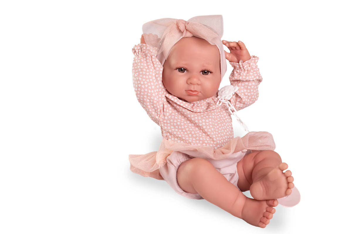 Recién Nacida Luca es una muñeca muy coqueta que adora ir de paseo. Siempre lleva su bolsito con orejitas para guardar sus cosas y luce un tutu a juego con su diadema, añadiendo un toque de estilo adorable.