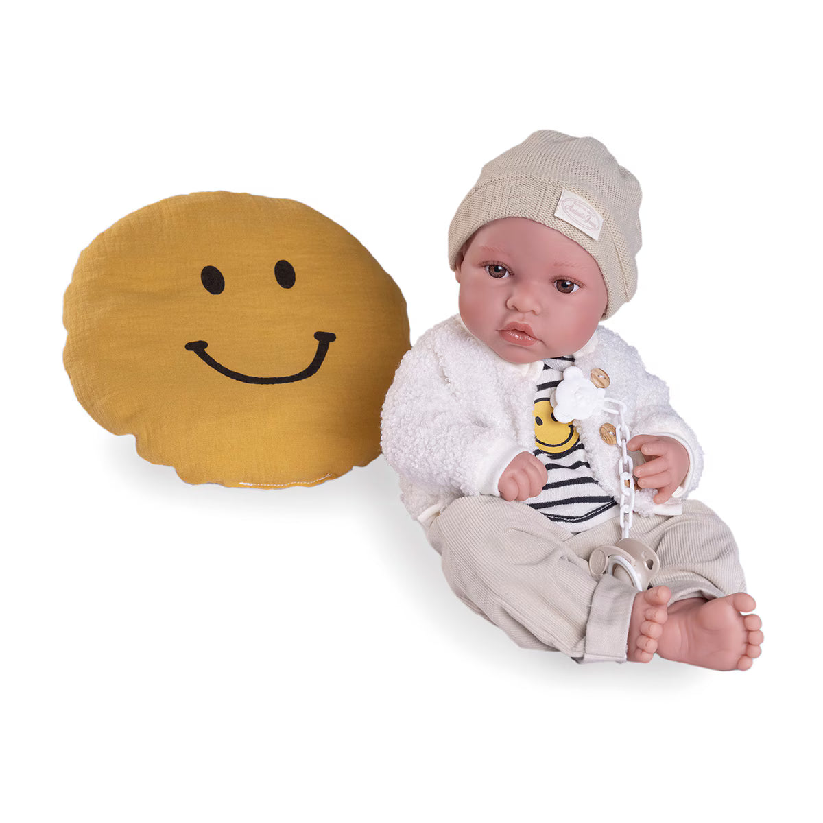 Perfecto para acompañar a los niños en el descubrimiento del mundo a través del juego simbólico y la imaginación, Erik representa la esencia de los Recién Nacidos de Muñecas Antonio Juan.