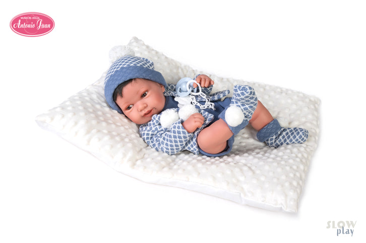 Viste un conjunto azul con gorro, chaqueta y calcetines decorados con graciosos pompones, ofreciendo un look tierno y divertido. Le encanta descansar en su cómodo cojín que asemeja algodón, brindando momentos de juego y ternura.