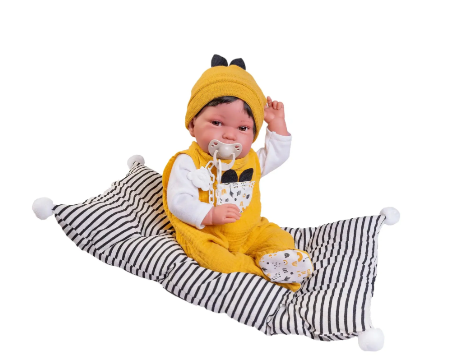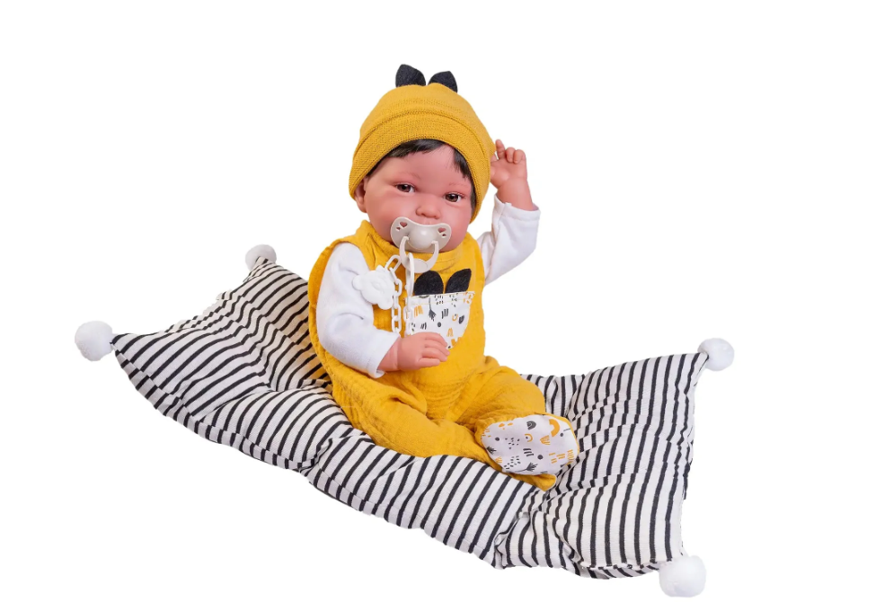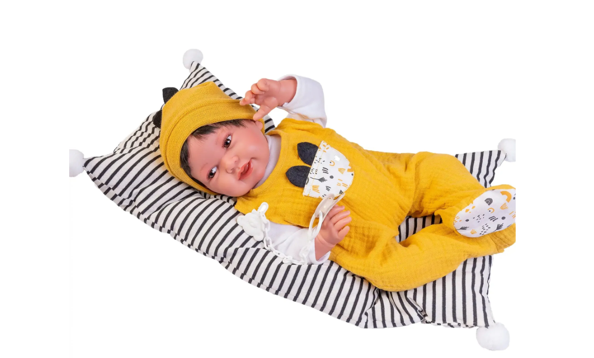 Hazte amigo de nuestro alegre y juguetón Recién Nacido Pipo orejitas con cojín de Muñecas Antonio Juan. Vistiendo un encantador mono de color mostaza y un gorro con orejitas, Pipo está listo para explorar y divertirse.
