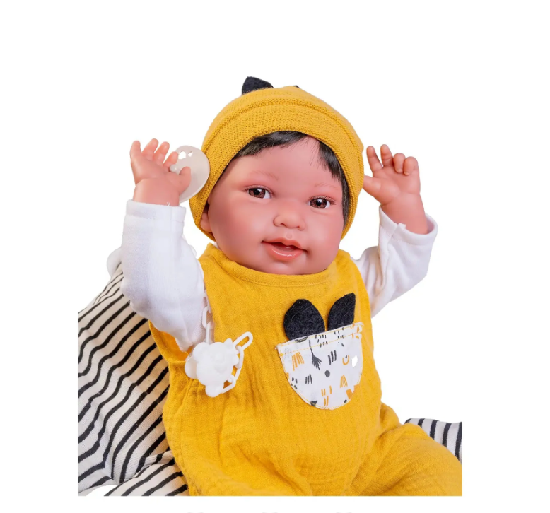 Pipo siempre está contento y preparado para jugar. Hoy se ha vestido con un bonito mono de color mostaza, y un gorrito con orejas. Se divierte mucho sentado en su cojín de rayas. Cuando tenga sueño, le puedes poner su chupete y descansará sobre su cojín. Su cuerpo es de tela blandito para poder abrazarlo suavemente y su cara y extremidades de suave vinilo. Mide 42 cm y pesa 800 gr. ¡A pipo le encantará jugar contigo! Puede colocarse en muchas posiciones como un bebé real porque sus extremidades giran, tiene movimiento, lo que le hace tener más realismo. ¿Hay algo más adorable que un bebé? Los Recién Nacidos son la esencia de Muñecas Antonio Juan. Un universo de dulzura creados para acompañar a los más pequeños a descubrir el mundo. Compañeros inseparables de largos días de juegos a los que no les falta detalle en sus tiernas facciones y calidad de su ropita y complementos.