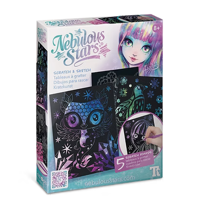 Descubre una galaxia colorida llena de estrellas debajo de cada una de estas 5 tarjetas para rascar. Viene con herramientas para estarcir y rascar.