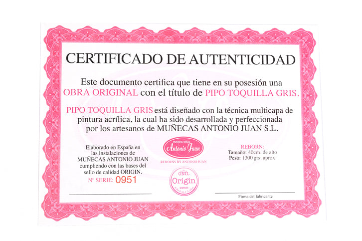 Con un peso de 1090 gr, esta muñeca es ideal para el juego de imitación y también para coleccionistas que buscan un Reborn exclusivo y detallado. Cada muñeca incluye su certificado de autenticidad con numeración única, garantizando su exclusividad como Reborn de Muñecas Antonio Juan.